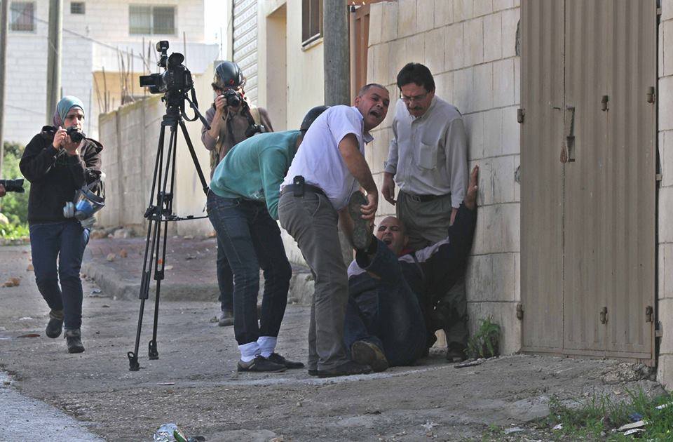 في الصورة لحظة إصابة مصور تلفزيون فلسطين بشار نزال - بعدسة أيمن نوباني