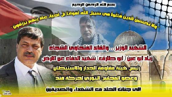 نعت اللجنة المركزية لحركة التحرير الوطني 'فتح' إلى جماهير الشعب الفلسطيني وجماهير الأمة العربية وأحرار العالم الشهيد القائد زياد أبو عين، عضو المجلس الثوري لحركة فتح، ورئيس هيئة مقاومة الاستيطان والجدار.